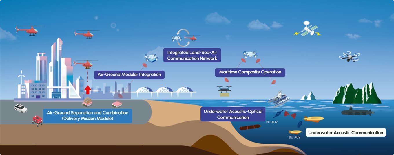 The main goal is to secure innovative, original technologies that can take an early lead in the next-generation unmanned vehicle market and increase technological competitiveness by developing a system for integrated operation, such as cooperation, docking-undocking of heterogeneous multiple unmanned vehicles.