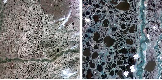 가. 사진 1. 최초로 상용배포된 캐나다 허드슨 베이와 러시아 시베리아 지역 위성영상(제공된 영상은 캐나다와 러시아의 습지지역으로 지구 온난화 및 산림자원 연구에 활용될 예정임)