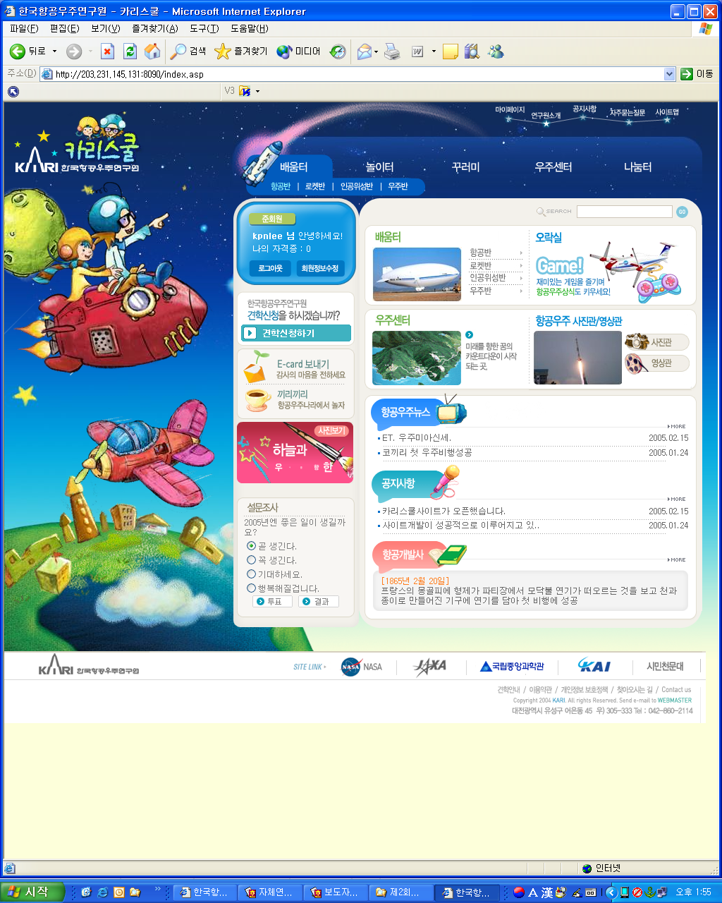한국항공우주연구원(원장·蔡連錫)은 3월 7일부로 항공우주 과학교육전문 인터넷 사이트인 카리스쿨()" 공식 오픈하고 본격적인 운영에 들어간다고 밝혔다.