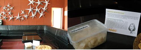 5. 가가린 우주인 훈련센터 건물 내에 마련된 휴게실에 한가위를 나누기 위해 놓아둔 송편과 한가위를 간단히 설명한 안내글