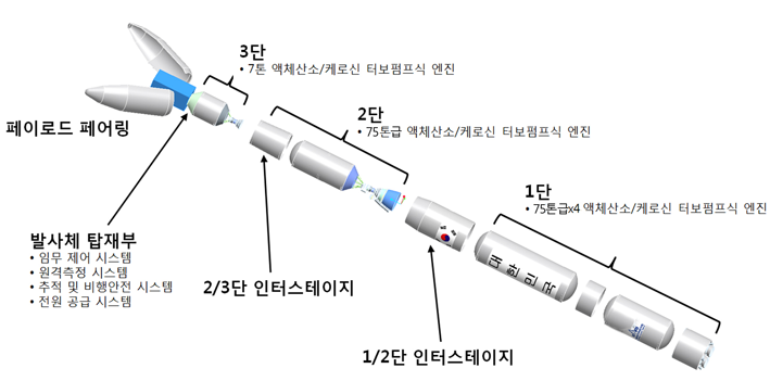 ※ 한국형발사체는 나로호 개발의 기술과 경험을 바탕으로 국내 주도의 기술로 개발되는 3단형 우주발사체로, 1단은 75톤 액체엔진 4기, 2단은 75톤급 액체엔진 1기, 3단은 7톤급 액체엔진 1기로 구성됨 |
