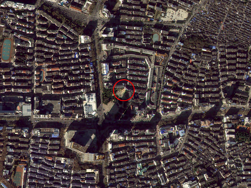 - 다목적실용위성 3A호가 촬영한 상해 임시정부. 현재 유럽풍 거리로 유명한 신천지거리 맞은편에 위치해 있다.