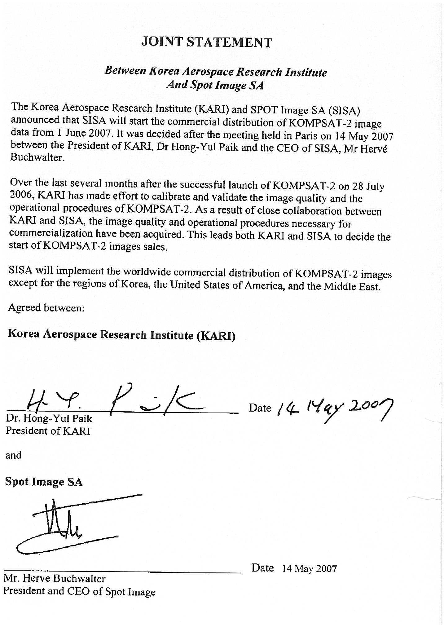 첨부 1. 다목적실용위성 2호 상용판매 공동발표문 사본