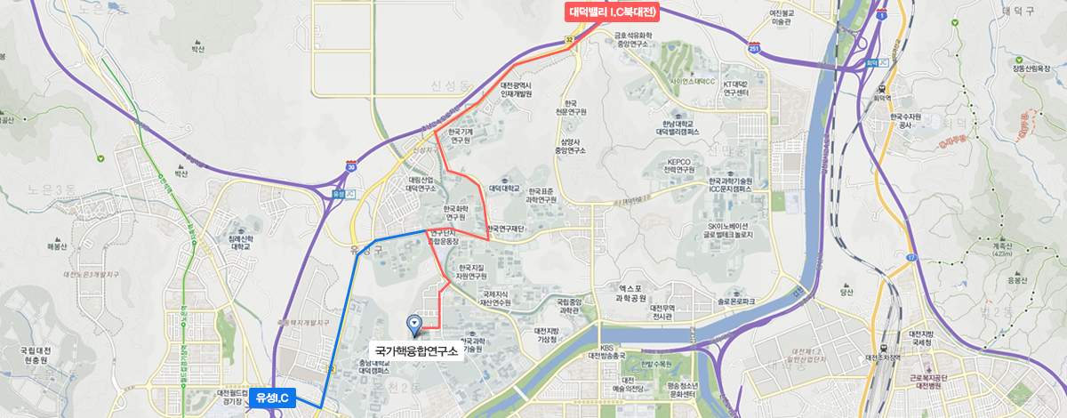 호남고속도로 → 유성IC ‣ 유성 IC → 국가핵융합연구소 (약 15분 소요) ‣ 대전 IC → 국가핵융합연구소 (약 30분 소요) |
