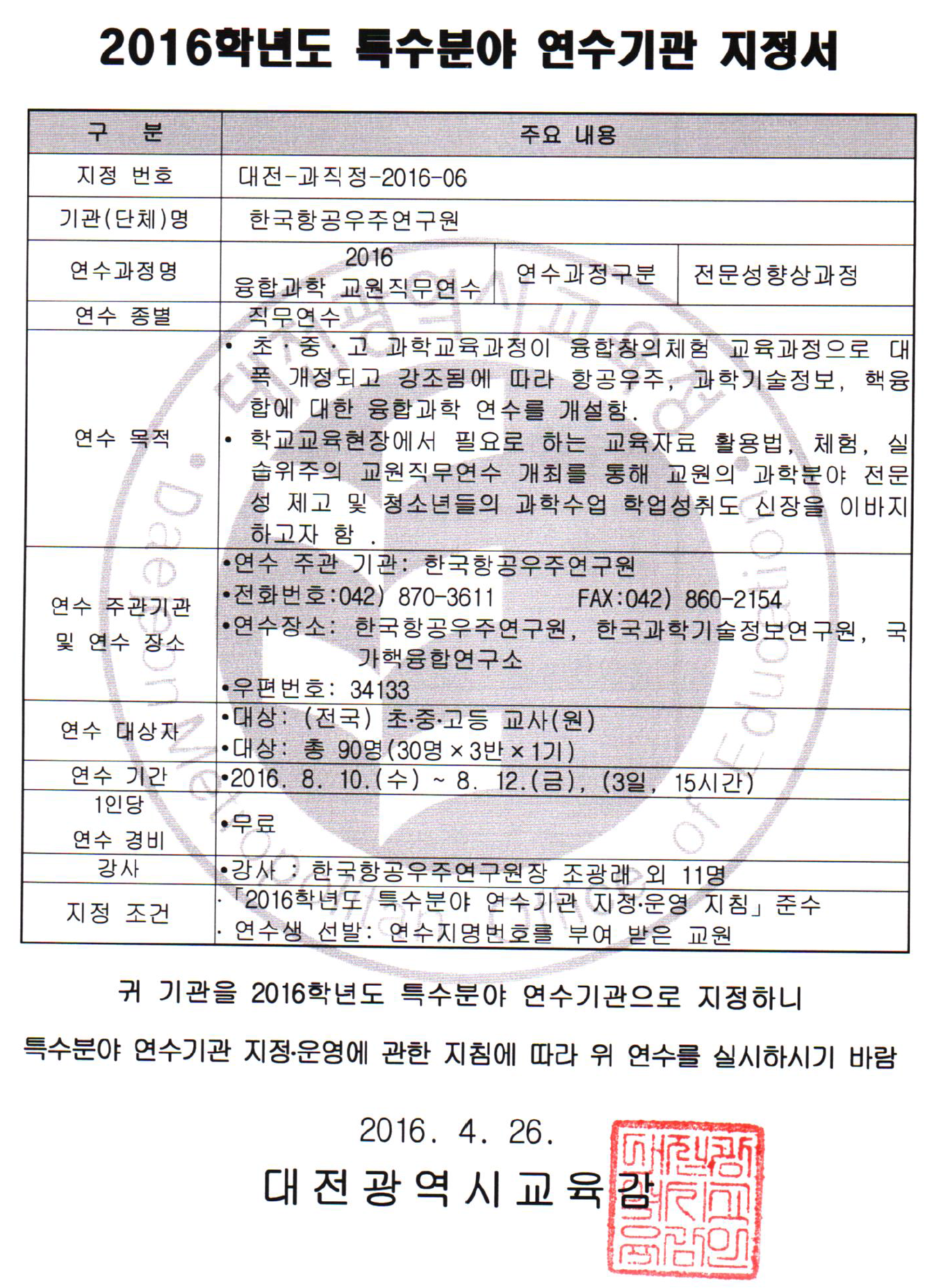 3. 특수분야 연수기관 지정번호 : 대전-과직정-2016-06