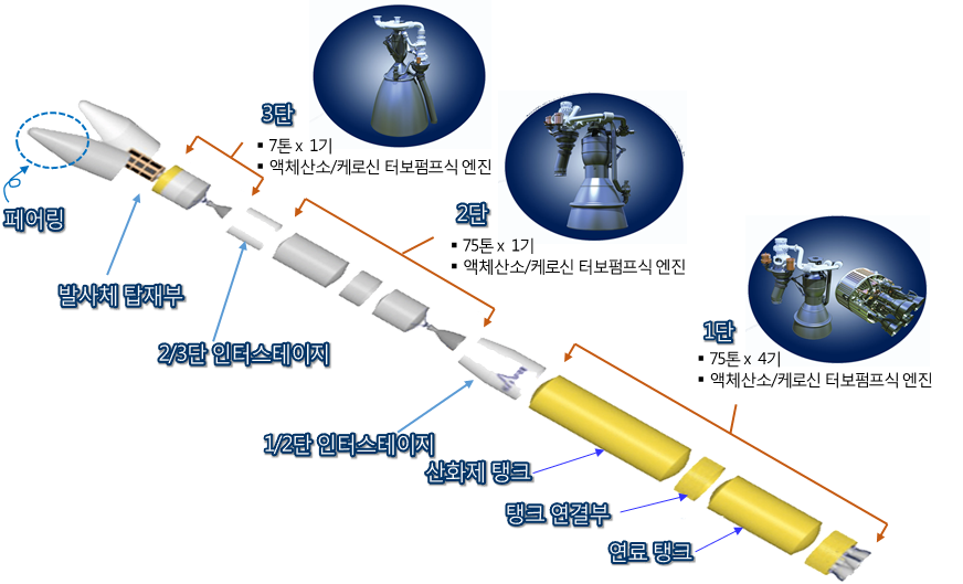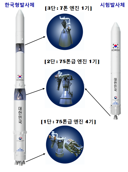 한국형발사체: 1단 75톤엔진 4기, 2단 75톤엔진 1기, 3단 7톤엔진 1기로 구성되어 1.5톤급 실용위성을 지구 저궤도(600∼800km)에 투입 가능한 우주발사체