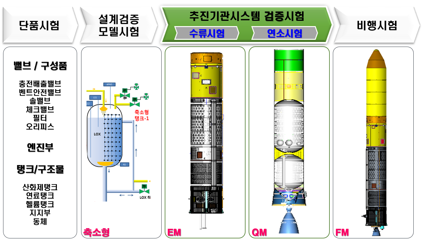 체계개발모델(EM, Engineering Model): 성능검증(수류)시험 인증모델(QM, Qualification Model): 연소시험 비행모델(FM, Flight Model): 발사