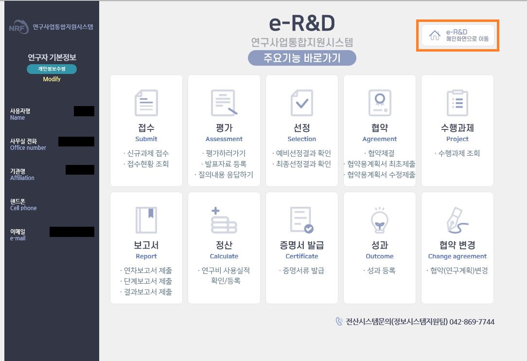 상단의 e-R&D 메인화면으로 이동을 선택합니다.