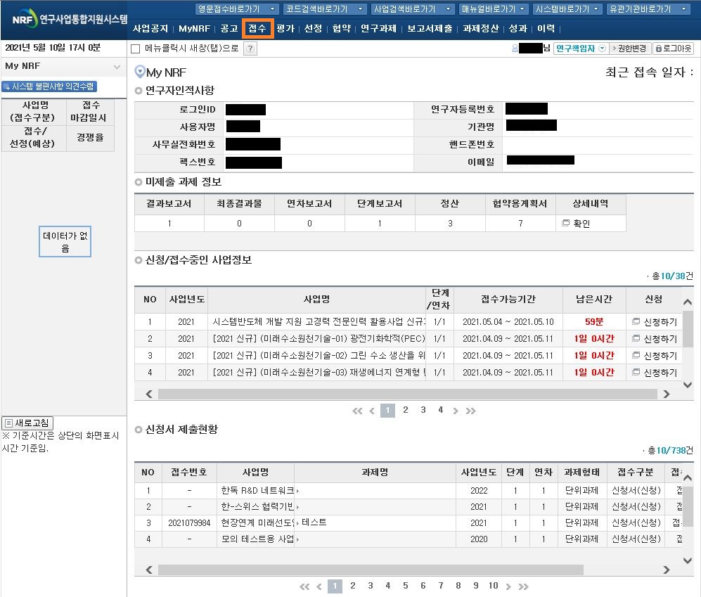 상단의 [접수] - 좌측의 [접수현황조회]를 선택하시고 신청하신 과제의 [신청서 수정] 버튼을 눌러 신청화면으로 들어갑니다.