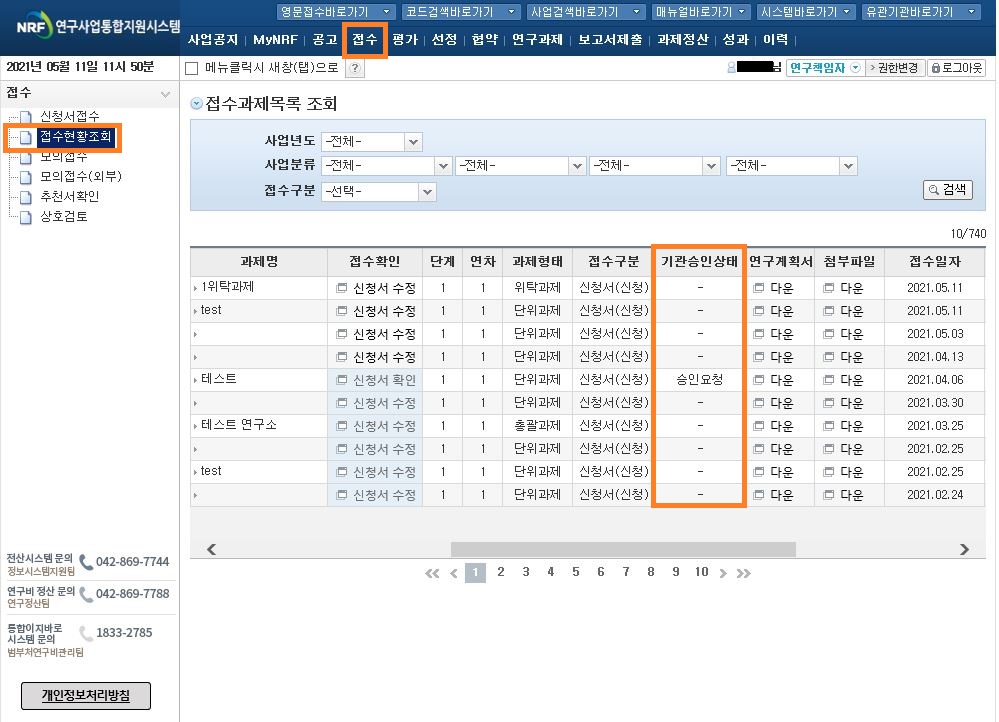기관승인은 각 과제의 수행기관에서 실시하며, 기관담당자 권한이 있어야 승인이 가능합니다.