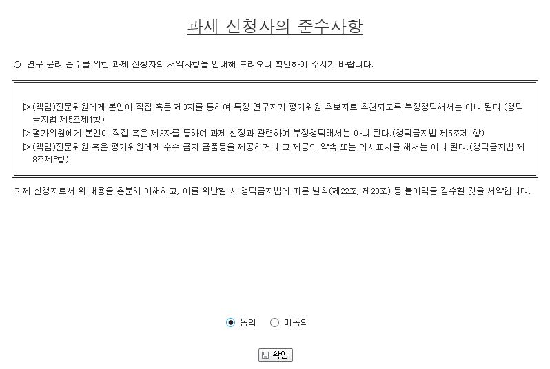 저장 후 과제 신청자의 준수사항동의 팝업이 뜹니다. 동의를 선택하고 [확인]을 누릅니다.