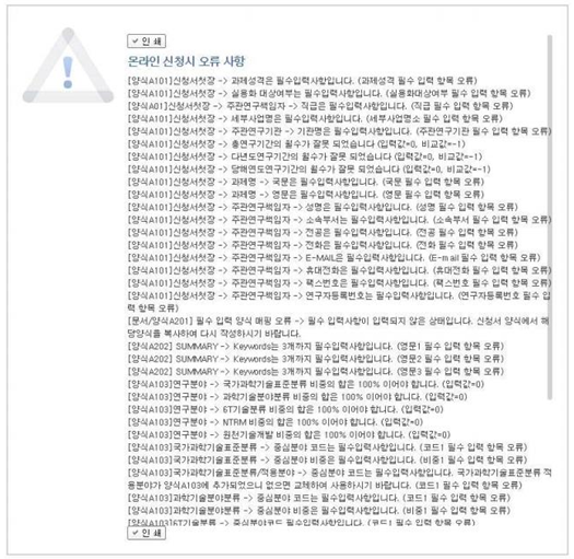 작성된 연구계획서의 데이터에 대한 유효성 검증 결과가 출력됩니다.