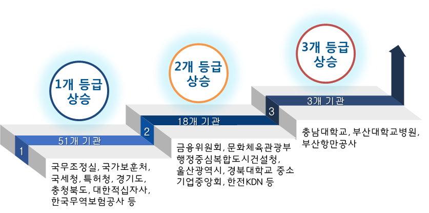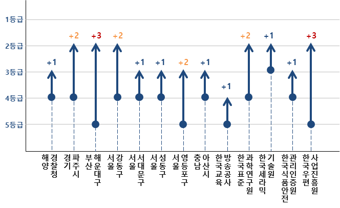 관세청(▼1등급) 농촌진흥청(-) 방위사업청(-) 새만금개발청(-) 행정중심복합도시건설청(▲2등급) |