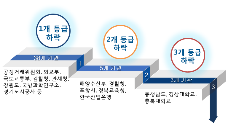 ※ 2년 연속 4․5등급(15개) : 기획재정부, 외교부, 서울특별시, 세종특별자치시, 인천 남동구, 공주대학교, 대한체육회 등