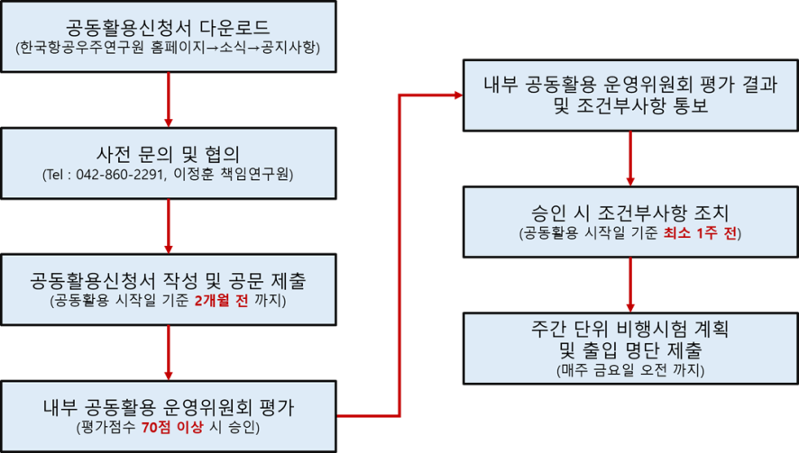한국항공우주연구원 산하 고흥항공센터의 공동활용 및 신청 절차에 필요한 사항을 사용기관(업체)에 제공하는 안내임