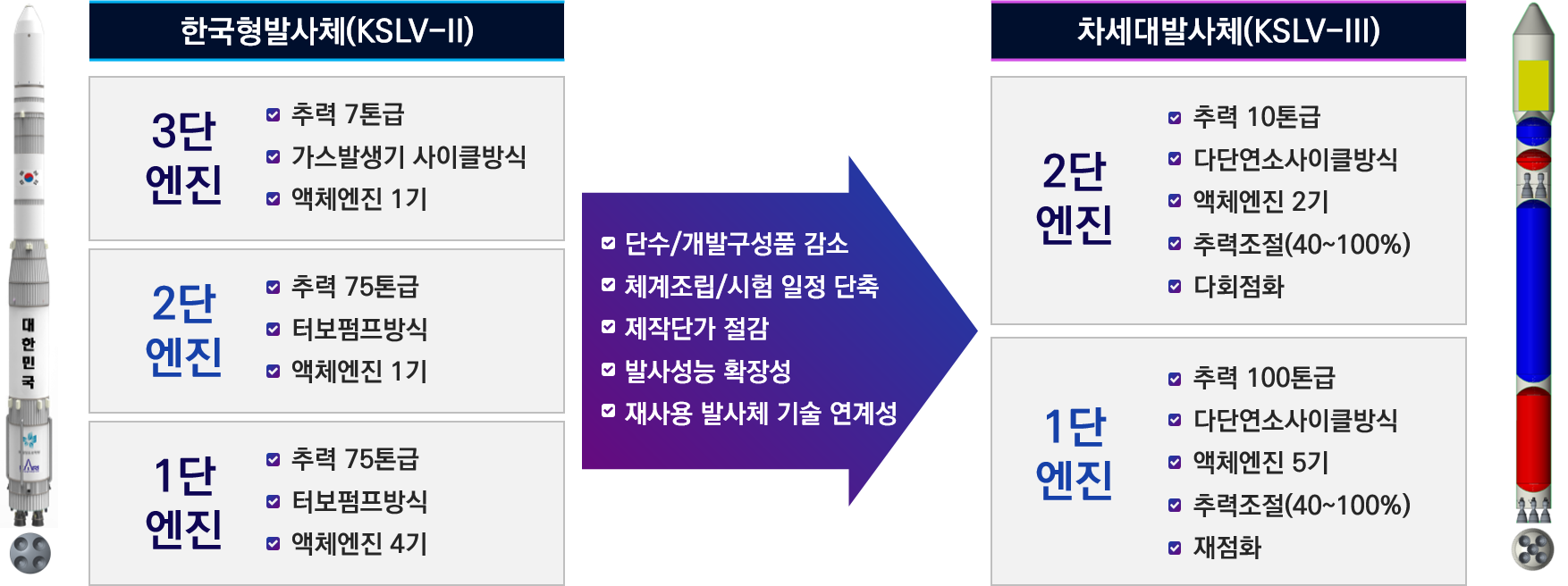 ㅇ 차세대 발사체는 액체산소-케로신 기반 2단형 발사체로 개발된다. 1단 엔진은 100톤급 다단연소사이클 방식 액체엔진 5기가 클러스터링 되고, 재점화, 추력조절 등 재사용발사체 기반기술이 적용되며, 2단 엔진은 10톤급 다단연소사기클 방식 액체엔진 2기로 구성되고 다회점화, 추력조절 등의 기술이 적용된다.