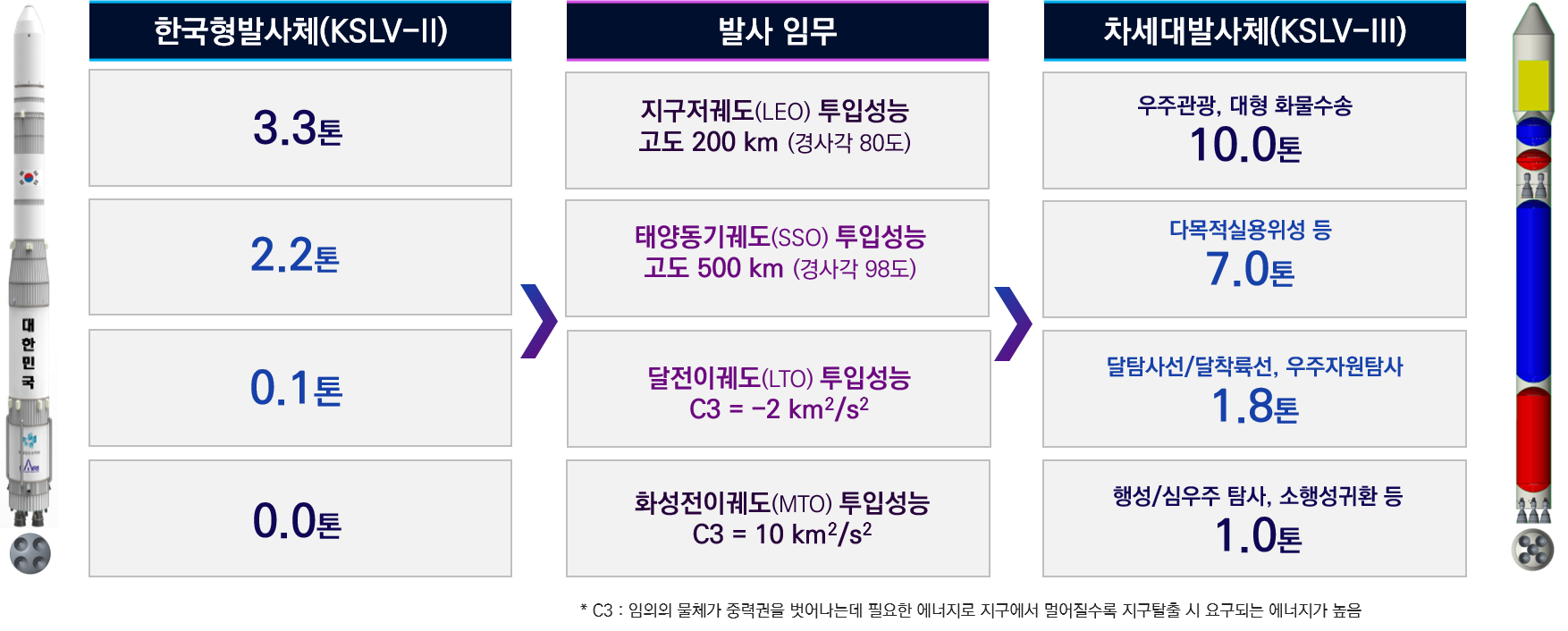 - 한국형발사체(누리호)* 만으로는 달착륙선 자력발사, 3톤급 대형위성 자력발사 등 국가 우주개발계획(제3차 우주개발진흥기본계획) 수행에 한계