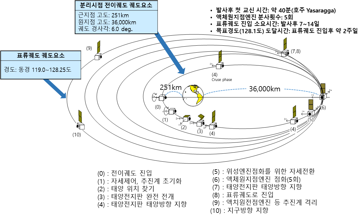 < 천리안위성 2B호 목표 정지궤도(적도 상공 36,000km) 획득과정 > |