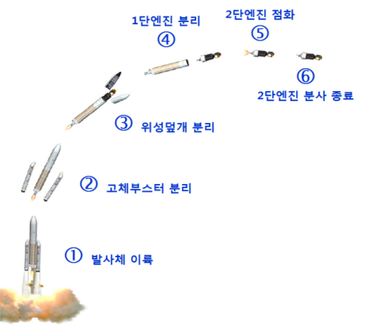 (1단계) 전이궤도 진입(L*+30분) * L = 발사시점(Launch) ◦ 발사체는 먼저 타원형의 전이궤도(Transfer Orbit, 251km~36,000km)에 진입하고, 천리안위성 2B호는 발사 약 34분 뒤에 발사체와 분리 (2단계) 태양위치 찾기(L+1시간) ◦ 위성이 발사체와 분리되면 자동 초기화되면서, 우선 원활한 전력확보를 위해 태양전지판이 태양을 향하도록 자세 변경 (3단계) 태양전지판 완전 전개(L+2시간) ◦ 자세변경 완료 후, 태양전지판 완전 전개가 자동으로 수행 (비상시에는 위성 내부 배터리가 전력 공급) (4단계) 위성엔진 분사를 위한 자세 전환(L+26시간) 및 엔진 분사(L+1.1일, L+2.0일, L+3.0일, L+4.8일, L+7.15일, 총 5회) ◦ 위성이 전이궤도의 원지점(고도 36,000km)에 도달했을 때 엔진을 분사하여 전이궤도에서 표류궤도로 상승(5회 수행) (5단계) 지구방향 지향(L+8일~13일) ◦ 지상국 교신 등 임무 수행을 위해 ‘지구지향자세’로 자세 전환 (6단계) 표류궤도에서 목표 정지궤도 진입(L+2주~3주) ◦ 표류궤도에서 고도를 높여 목표 정지궤도(동경 128.25도)로 진입 |