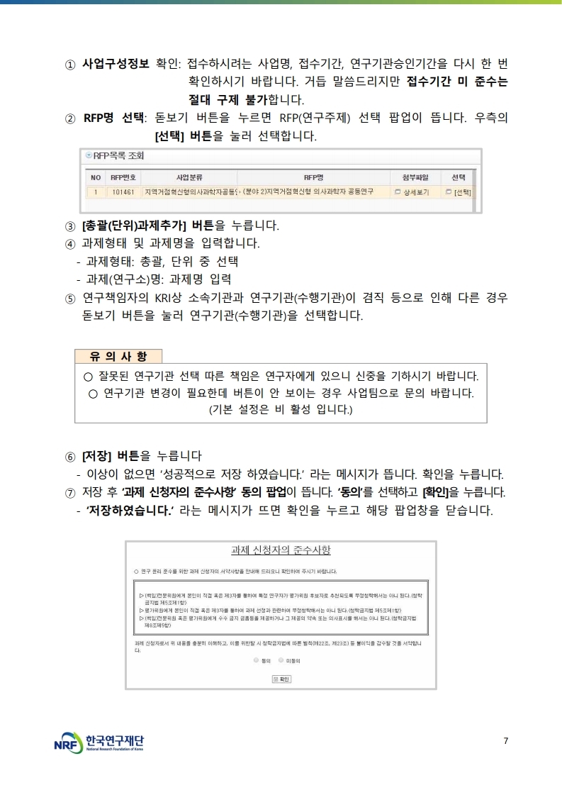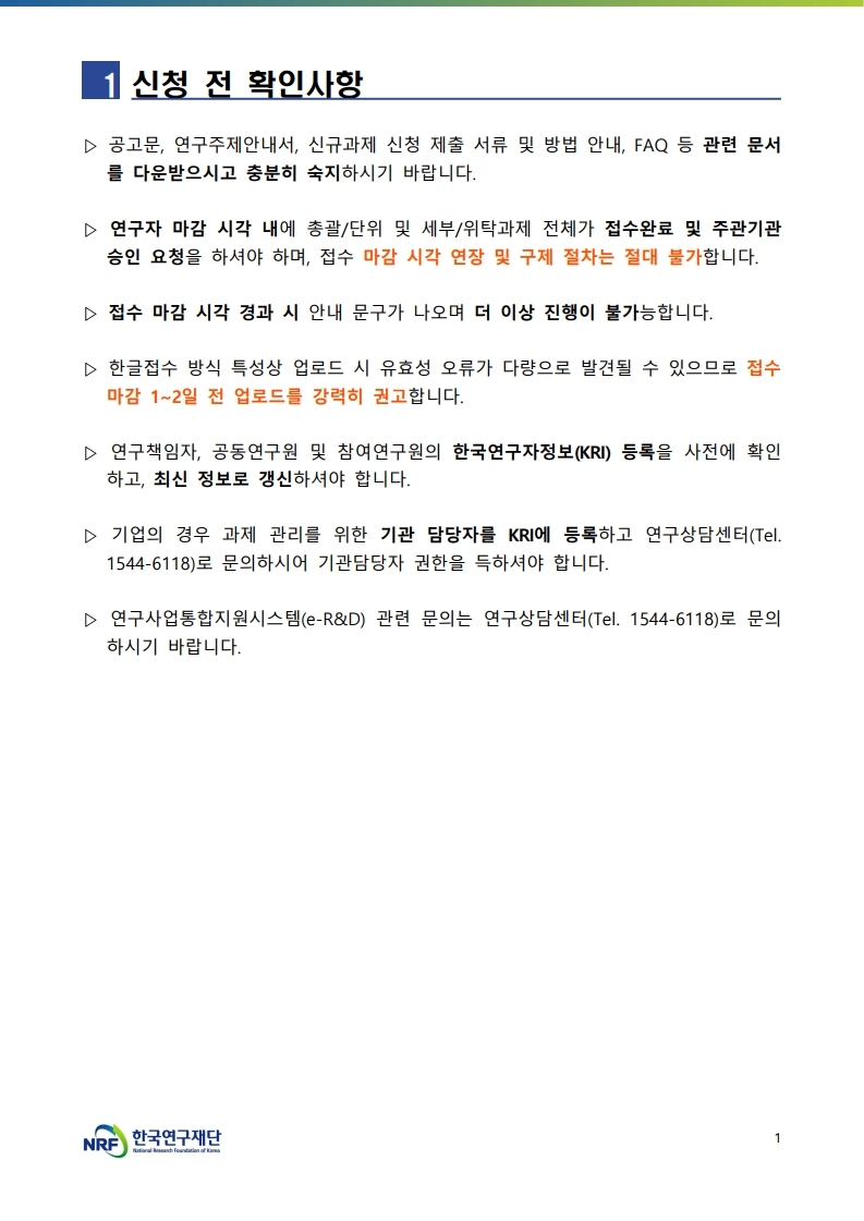 신규 신청과제의 연구책임자 및 연구원은 반드시 연구계획서 작성 전에 한국연구자정보시스템(KRI) 필수입력사항을 모두 기입하여 주시고, 입력된 정보는 최신정보로 수정(업데이트)하여 주시기 바랍니다.