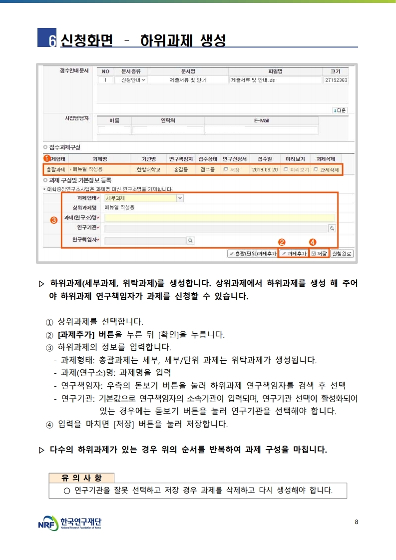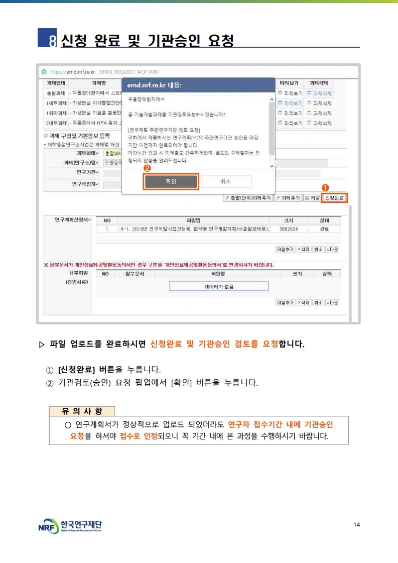 연구책임자는 신청마감일까지 계획서 등록 및 기관검토 요청을 필히 완료해야 하며, 연구책임자의 신청사항에 대해 주관연구기관장의 승인이 완료되어야 신청접수가 최종 완료됨.