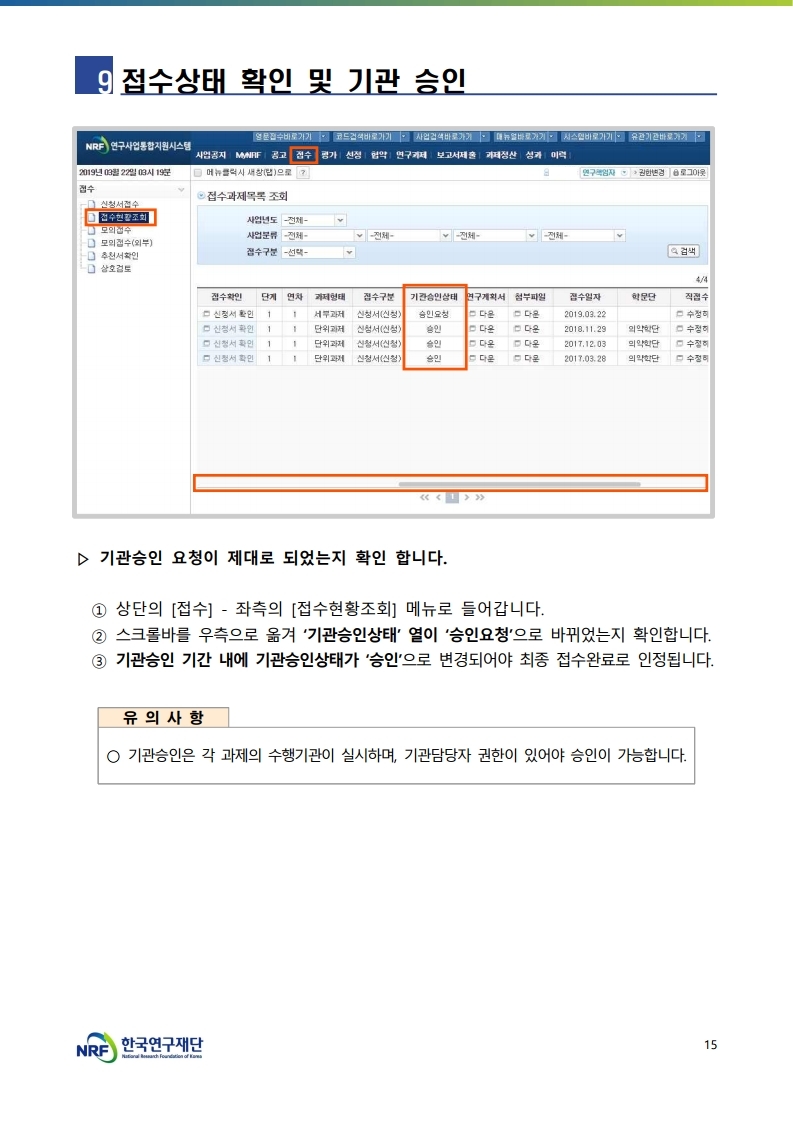 연구자 접수 주관연구기관 승인 신청 완료