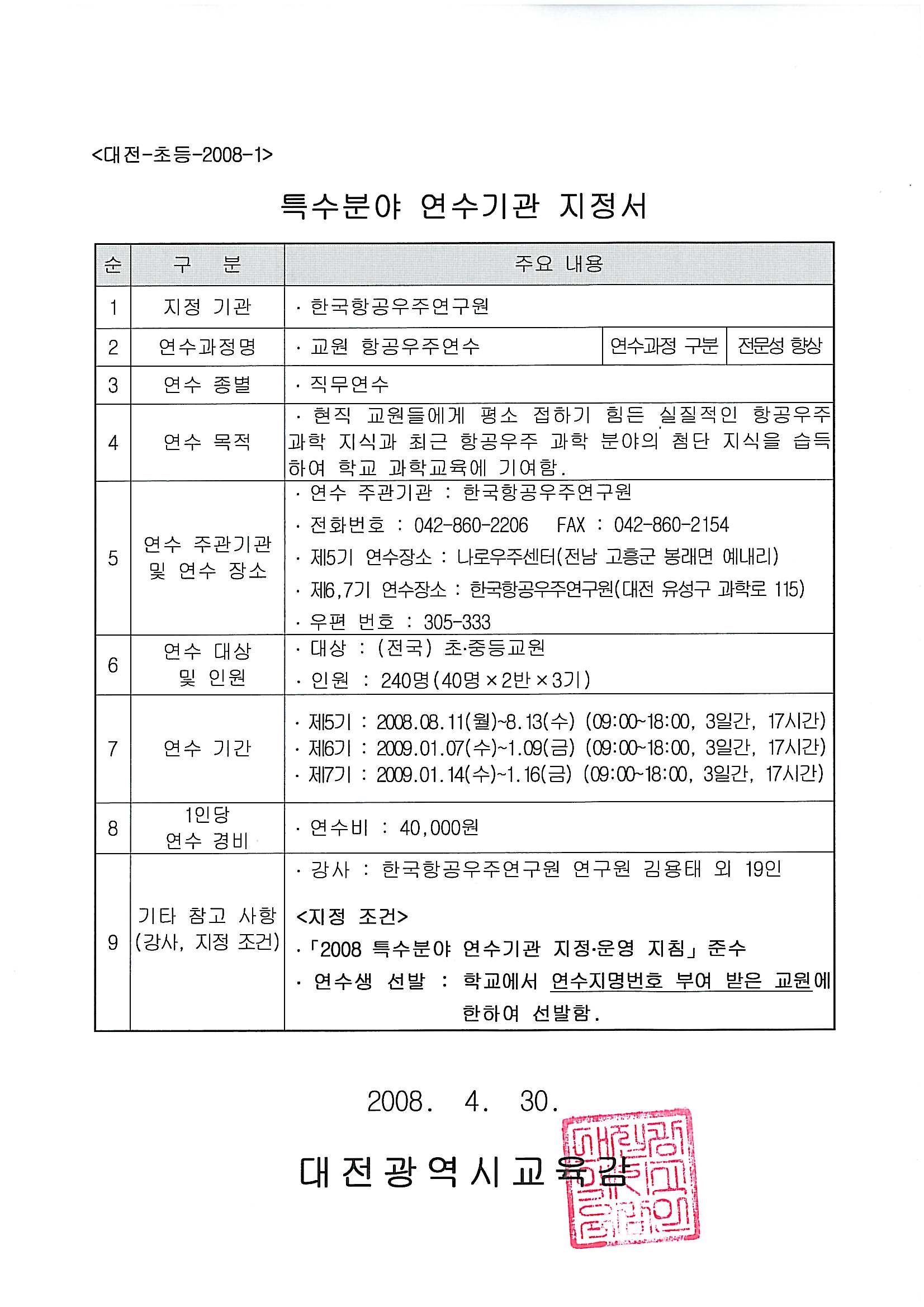 상기 본인은 한국항공우주연구원에서 실시하는 교원항공우주연수를 신청합니다. 2008년 월 일 신청인 : (인)