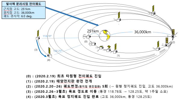 < 천리안위성 2B 목표 정지궤도(적도 상공 36,000km, 동경 128.25°) 획득과정 >