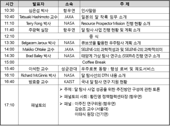 심포지엄에서는 한국형 달 탐사 사업의 진행 현황과 계획을 소개하고 국내외 달 탐사 관련 연구 현황과 향후 달 탐사 사업 추진방안, 산··연의 협력방안이 논의된다.