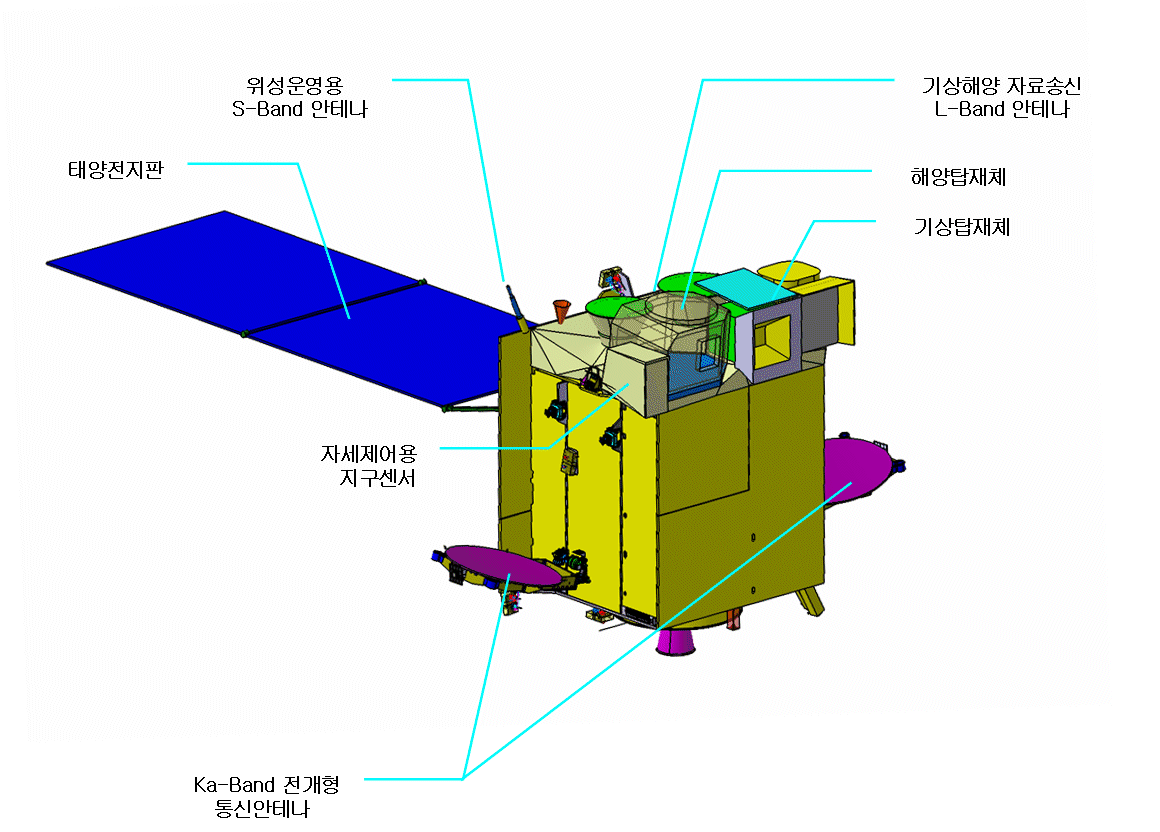 특히, 해양관측탑재체는 세계 최초로 정지궤도에서의 해양관측이 가능한 탑재체로 식물 플랑크톤의 분포, 적조 및 해양오염 정도 등을 관측할 수 있다.