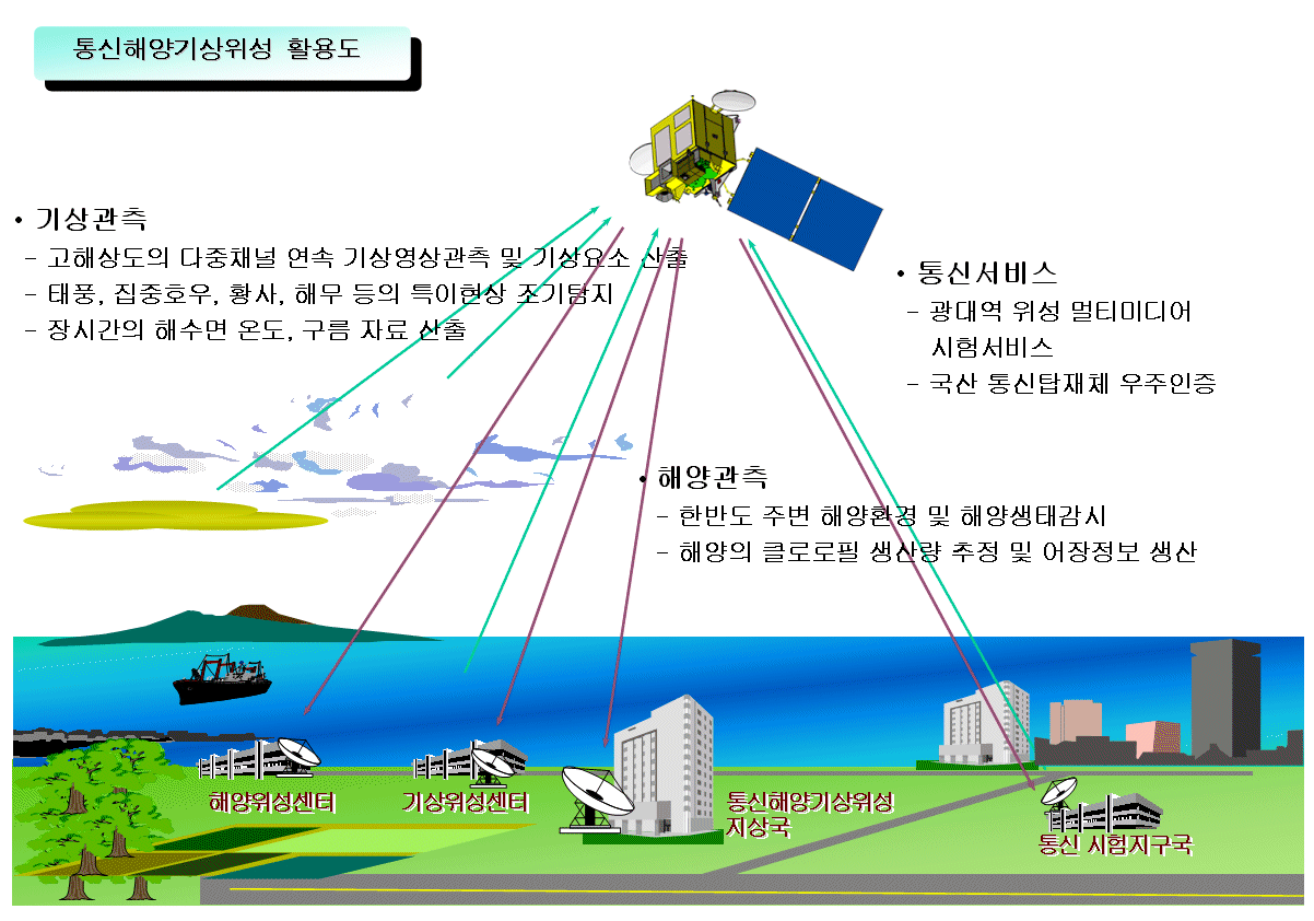 ○ 정지궤도 통신해양기상위성의 보유로 좀 더 빠르고 정확한 기상예측을 통해, 기상이변 및 재해 등에 미리 대비함으로써, 국가와 국민의 생명과 재산을 보호하는데 큰 역할을 할 것이며 한반도 연안을 지속 관찰하여 해양자원을 보호․개발하고 어민들에게 어장 자료를 제공하는 등 위성을 이용한 국가 재난 및 자원관리 시스템의 구축이 이루어질 전망이다.