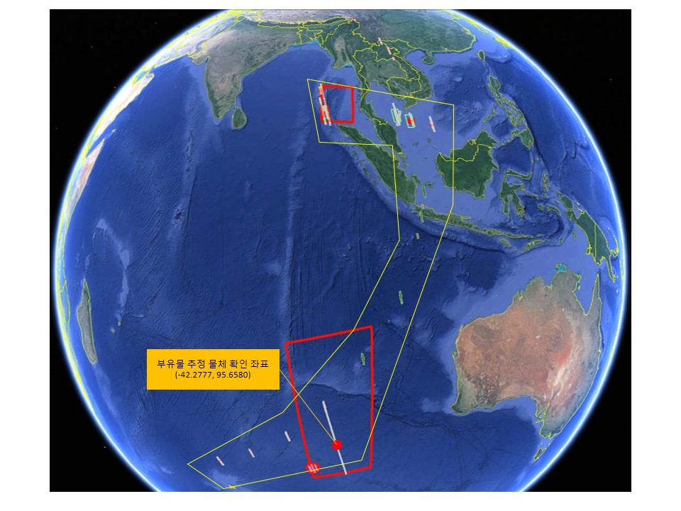 최근 태국 위성이 바다에 떠 있는 122개의 물체를 촬영(3.24)했다고 발표한 위치(Perth 남서쪽 2,700km 지역, 프랑스 위성 촬영 지역으로부터 200km 거리)에서 동쪽으로 약 480km 떨어진 지역에서 촬영된 것이다.