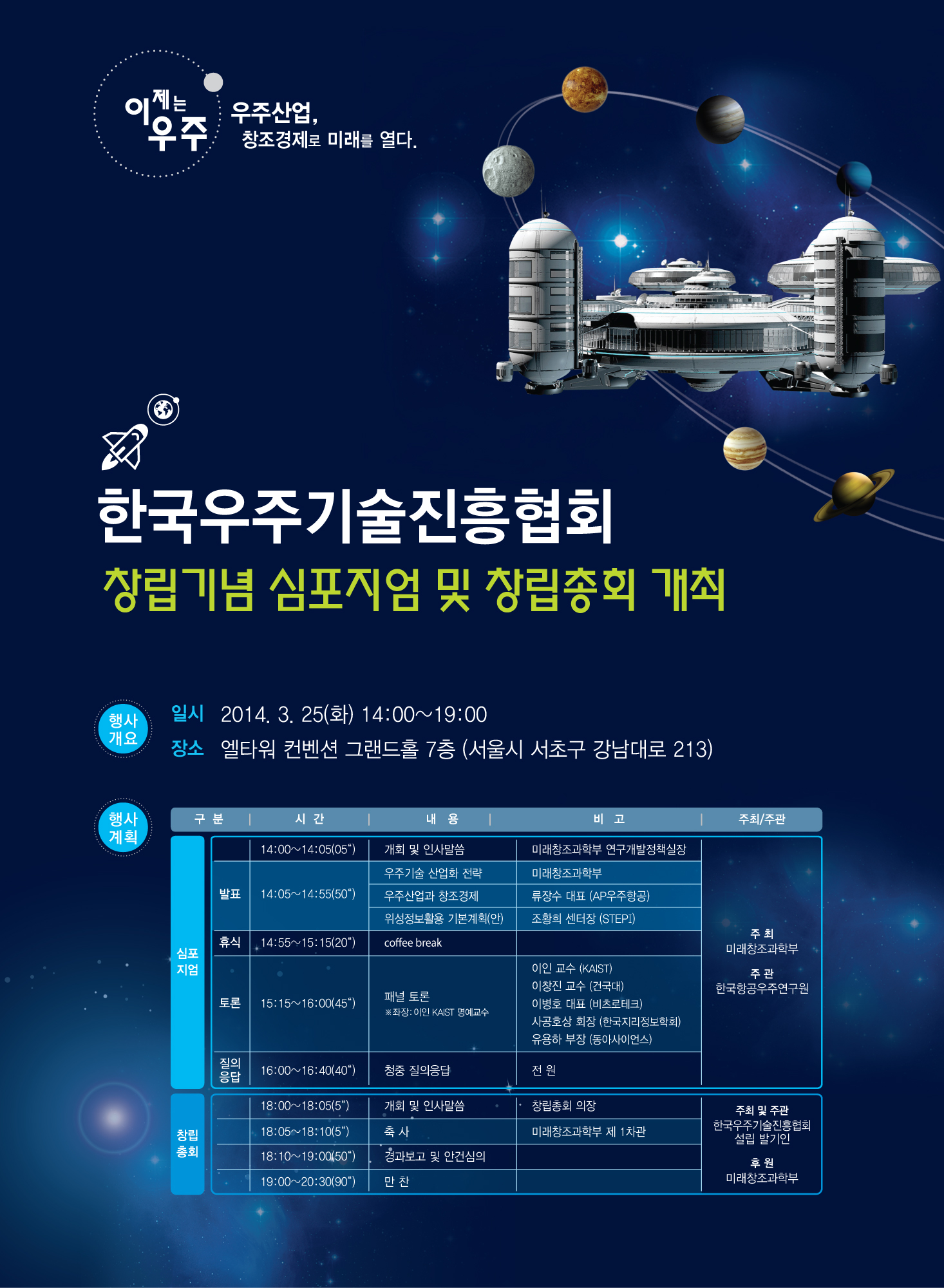 □ 미래창조과학부(장관 최문기, 이하 미래부)는 3.25(화) 오후 2시, 서울 양재동(엘타워 컨벤션)에서 산·학·연·관 관계자 200여명이 참가한 가운데『한국우주기술진흥협회 창립총회 및 기념 심포지엄』을 개최한다고 밝혔다.