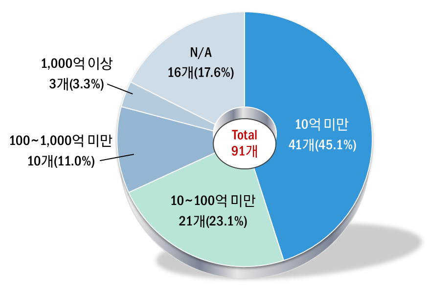 ○ 현황이 파악된 91개 산업체 중 우주부문 매출액 10억원 미만(45.1%), 종사자 100인 미만(68.9%) 업체가 다수