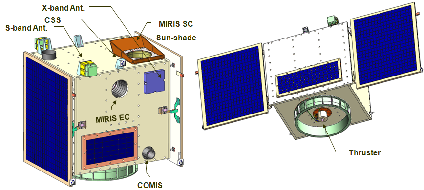 ※ MIRIS SC(우주관측 주탑재체), MIRIS EC(지구관측 주탑재체), COMIS(부탑재체), Thruster(전기추력기:핵심기술), 기타 4개 핵심기술은 본체에 포함되어 보이지 않음(우주용 리듐-이온 배터리, 다기능 복합재 구조체, 고성능 탑재컴퓨터, 소형전력조절기).