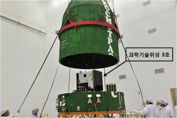< 발사체 상단 플랫폼에 장착되고 있는 과학기술위성 3호 >