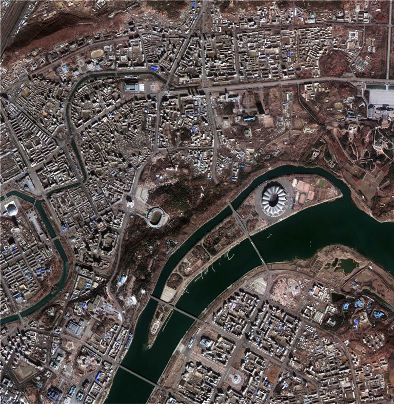 다목적실용위성(아리랑)2호가 촬영한 평양 5월 1일 경기장(능라도) 주변 위성영상