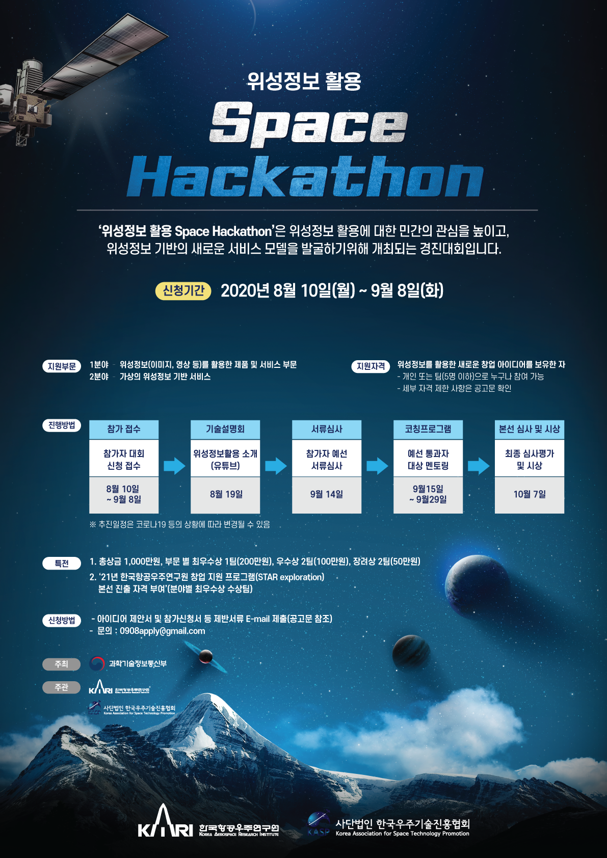 과학기술정보통신부(장관 최기영, 이하 과기정통부’)위성정보 활용에 대한 이해와 관심을 높이고, 위성정보기반의 새로운 서비스 모델을 발굴하기 위해위성정보 활용 Space Hackathon 개최한다고 밝혔다.