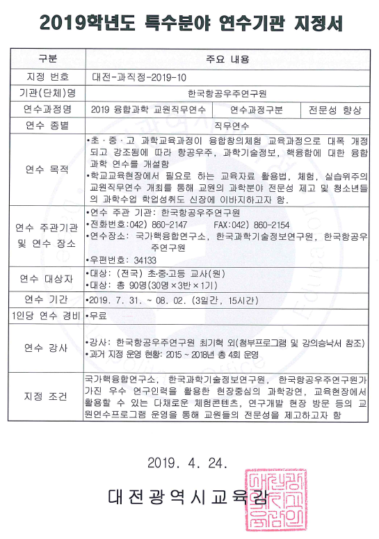 (190515) (붙임1) 2019 융합과학 교원직무연수 운영계획.hwp
