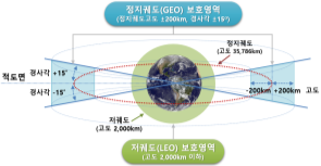 * 저궤도(LEO) : 지구 표면부터 높이 2,000km까지, 정지궤도(GEO) : 지구 표면으로부터 높이 약 36,000km에서 ±200km, 경사각은 –15도 이상부터 +15도의 구간
