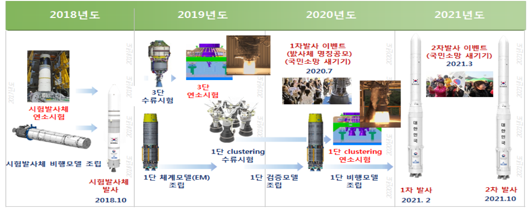 ㅇ 1차 3단형 본발사 일정은 당초 ‘19.12월에서 ’21.2월(14개월 연장), 2차 발사일정는 ‘20.6월에서 ’21.10월로(16개월 연장) 조정하였으며, 발사 일정 조정에 따라 사업기간도 1년 연장(’21.3월→’22.3월)하였다.