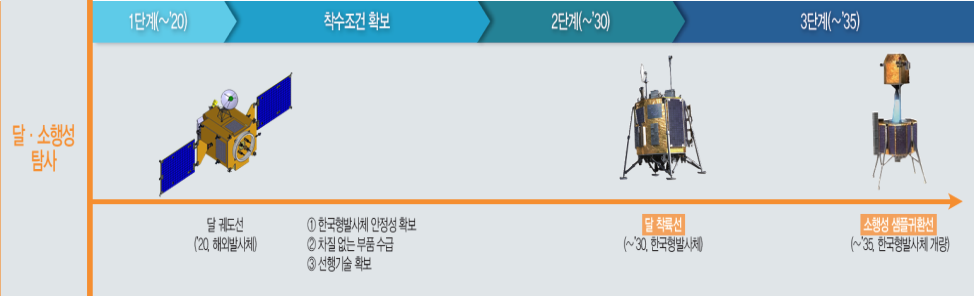 - 달 착륙 후의 임무는 달 귀환에서 소행성 귀환으로 변경하여 2035년까지 추진할 계획이나, 전략기술의 조기확보를 위해 고난이도 기술인 지구재진입‧도킹 기술은 ‘21년부터 개발에 착수한다.