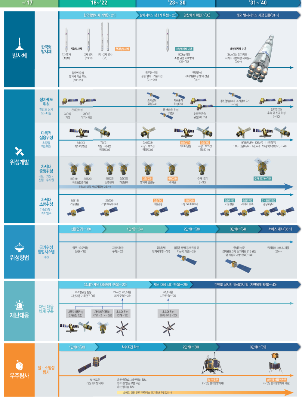 - 한국형발사체 완성 이후, 우선 경제적인 비용의 500kg이하 위성발사가 가능한 소형발사체로 확장(‘25~’30)하고, 이후 3톤급 정지궤도위성 발사가 가능한 대형발사체로 확장(‘30~’40)해 나간다는 방침이다.