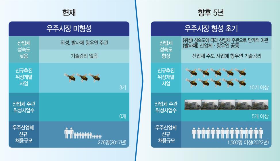 ㅇ 위성과 발사체 등 대형 프로젝트사업 운영 위주인 항공우주연구원의 역할을 단계적으로 민간에서 개발하기 곤란한 핵심기술 개발과 산업체에 대한 기술 검증과 지원 등으로 전환하여 자생적인 우주개발 생태계를 조성을 지원해 나갈 계획이다.