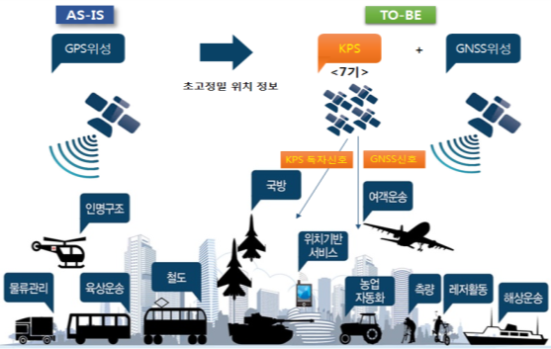 □ (한국형 위성항법시스템 구축) 4차 산업시대의 성장동력 기반인 위치‧시각정보의 안정적 확보를 위해 한반도 인근을 대상으로 하는 한국형 위성항법시스템(KPS: Korea Positioning System)을 구축하여 2035년부터 서비스를 제공한다는 새로운 도전을 시작한다.