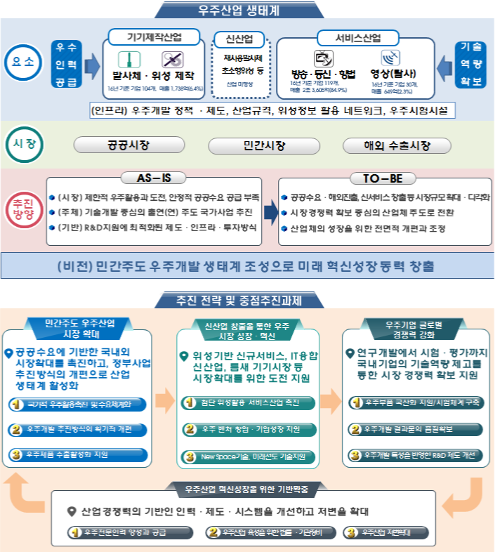 ㅇ 관련부처가 참여하는「우주조정위원회」를 신설하여 공공수요를 발굴·조정하고, 해외 수출 촉진을 위한 R&D 사업 등을 지원하여 국내·외 시장을 확대하며, 위성, 발사체 등 기기제작을 산업체가 주관하는 시기도 구체적으로 제시하였다.