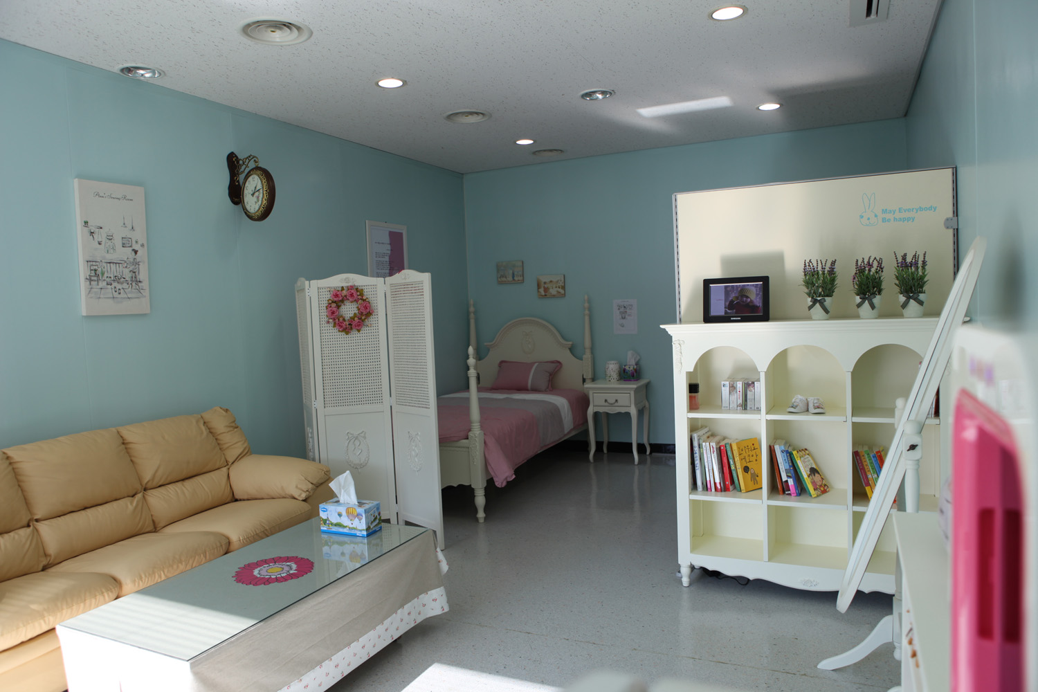 임신에서 오는 몸의 변화로 불편함을 잠시 해소할 수 있는 편의 시설로 침대와 쇼파, CD 플레이어 등을 구비하였다. 이는 산모와 뱃속의 아기에게 좋은 휴식공간을 제공할 수 있으리라 기대한다.