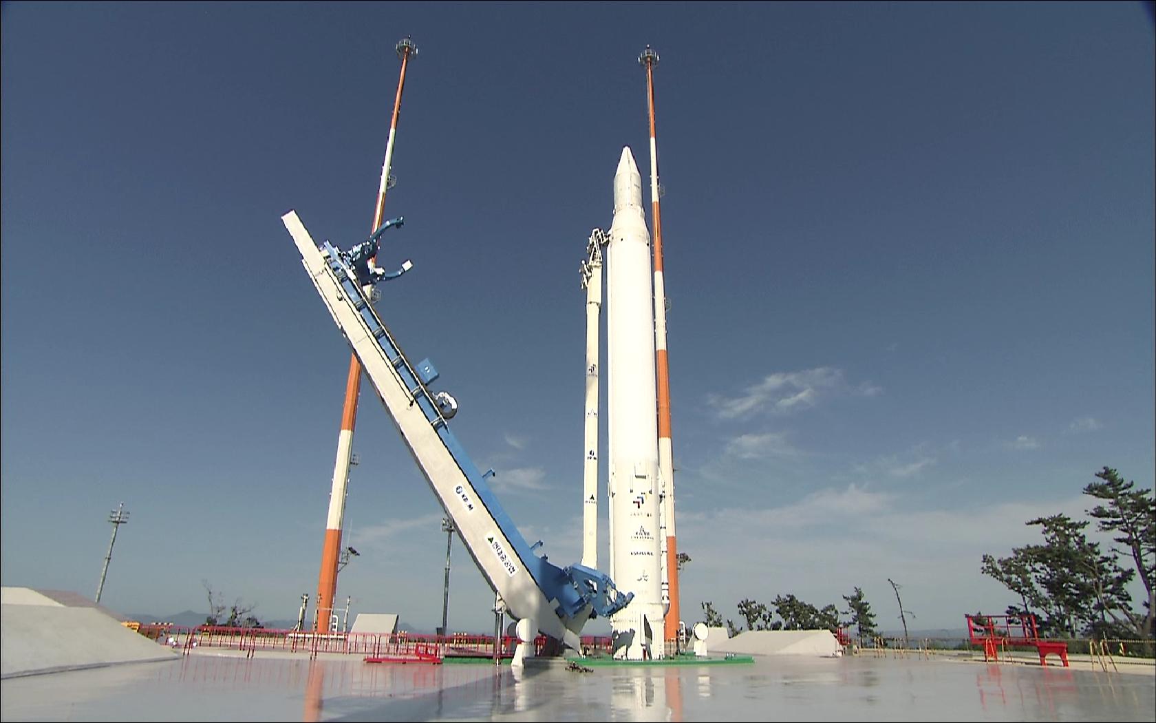 [그림2] 발사대 인증시험 중 나로호에 연료와 산화제를 주입한 후 발사를 위해 이렉터(erector) 분리를 시험하는 장면(영하 185°C의 액체산소가 주입되어 발사체 표면에 얼음이 얼어있다.)