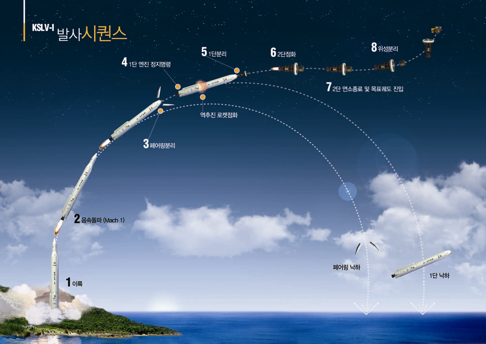 □ 나로호는 발사 약 4분 후 위성 보호덮개인 페어링(fairing)과 발사체 1단을 순차적으로 분리하고 계속 우주로 날아가, 발사 약 9분 후에는 300km의 고도에서 약 8km/s의 속도로 위성을 최종 분리하게 된다.