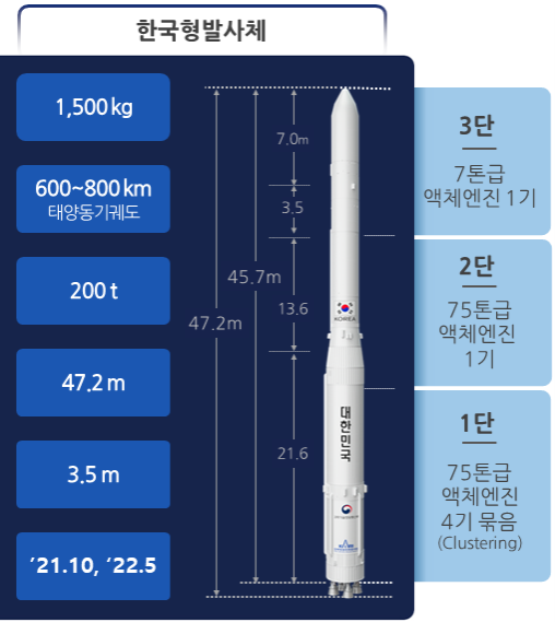 ㅇ 길이/중량 : 47.2m/200톤 ㅇ 탑재중량 : 1,500kg ㅇ 투입궤도 : 600∼800km ㅇ 최대직경 : 3.5m ㅇ 단 구성 - 1단 : 75톤급 액체엔진 4기 - 2단 : 75톤급 액체엔진 1기 - 3단 : 7톤 액체엔진 1기 |
